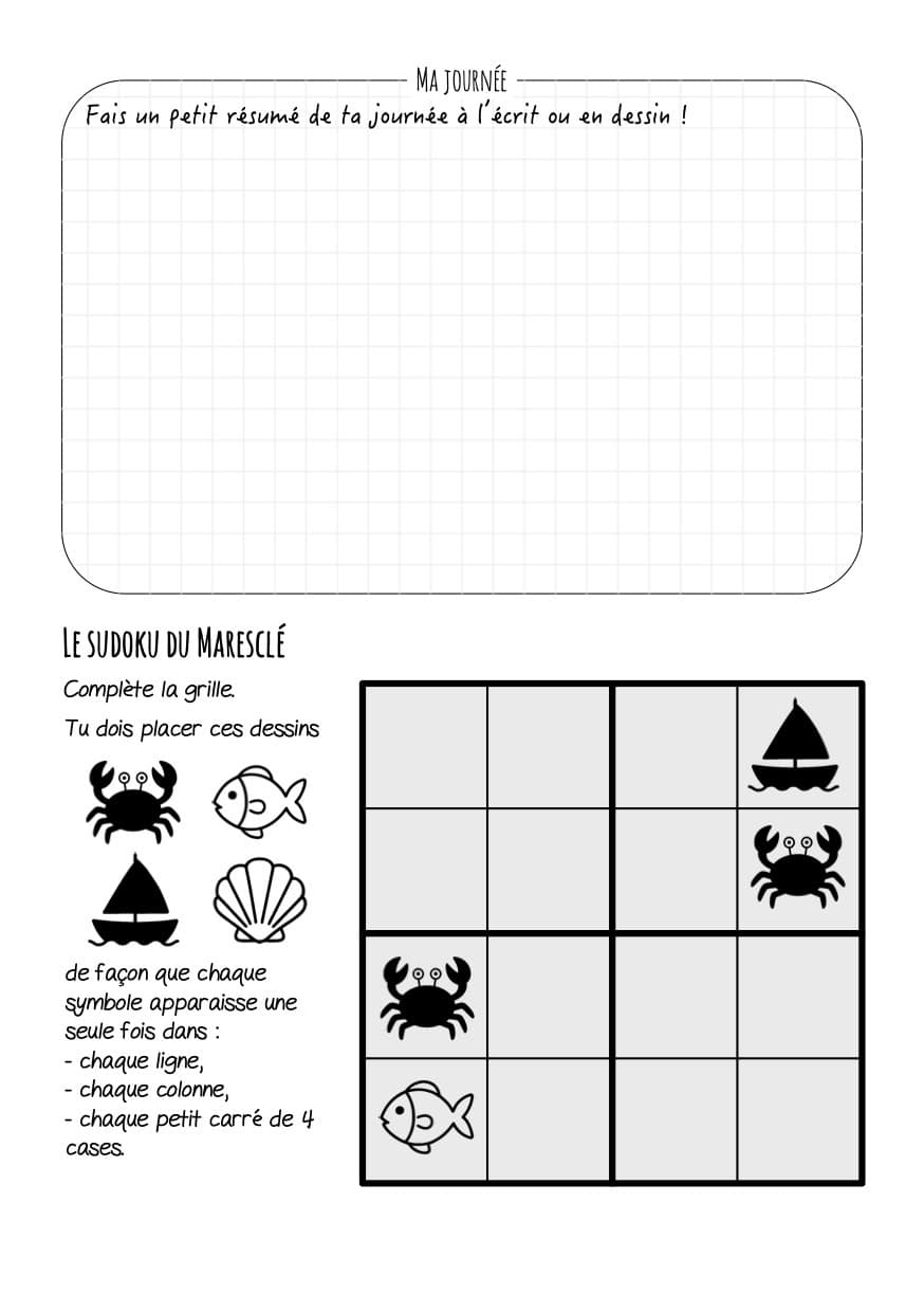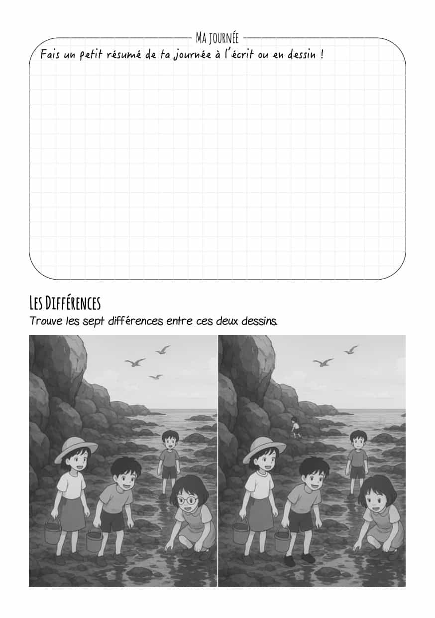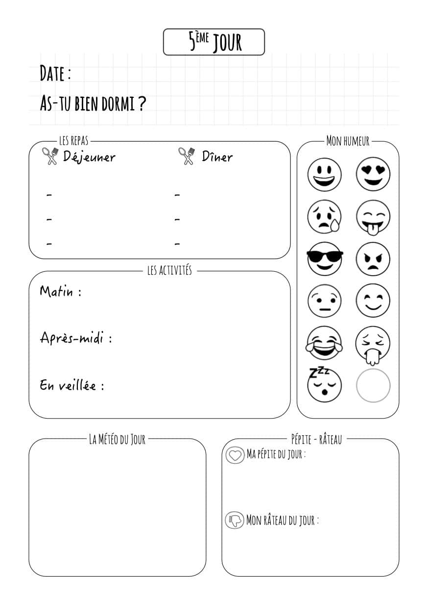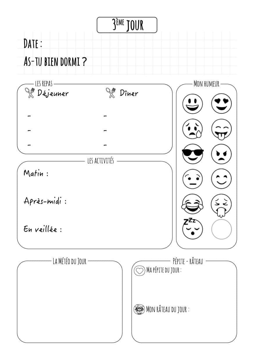 Carnet de séjour Pour imprimer sous forme de livret : VERSION IMPRIMABLE puis imprimer en A4 paysage – RECTO/VERSO – bord court. Page par page : Les jours : Jour 1 Jour 2 Jour 3 Jour 4 Jour 5 Jour 6 Jour 7 Jour 8 Les jeux : 1ere Veillée Points à relier Mots fléchés Mots Emmelés Mandala Labyrinthe 7 différences Sudoku Autres : Couverture Recto Couverture Verso Graf Présentation perso Présentation Maresclé Géographie Parole chanson Petits Mots